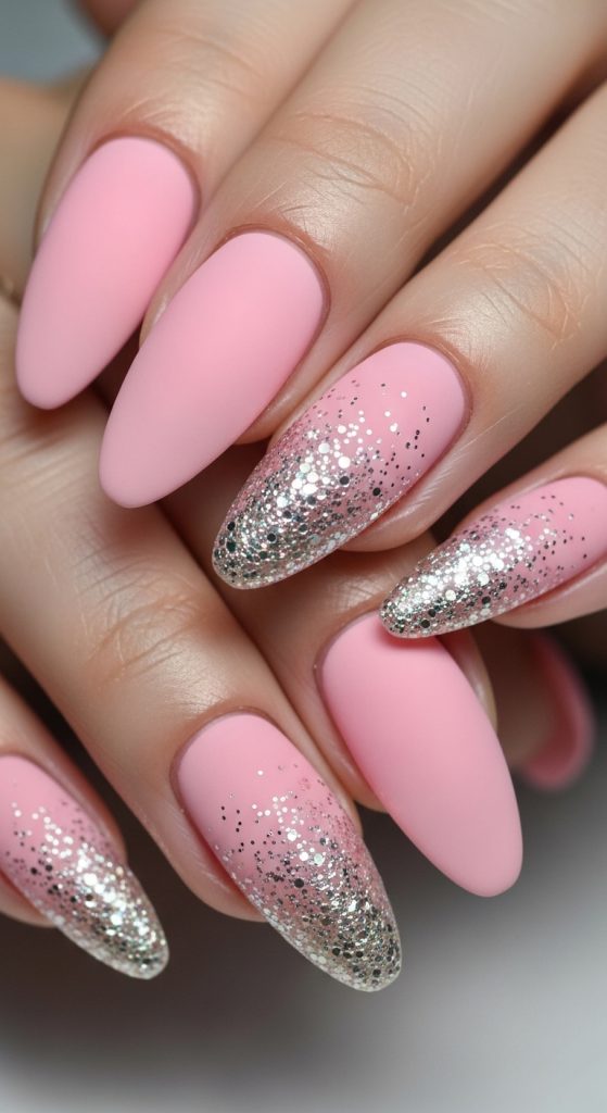 Combining matte pink polish with glitter ombre tips creates a stunning contrast between soft and sparkly textures. The matte finish gives a modern, velvety look, while the glitter tips add brightness.