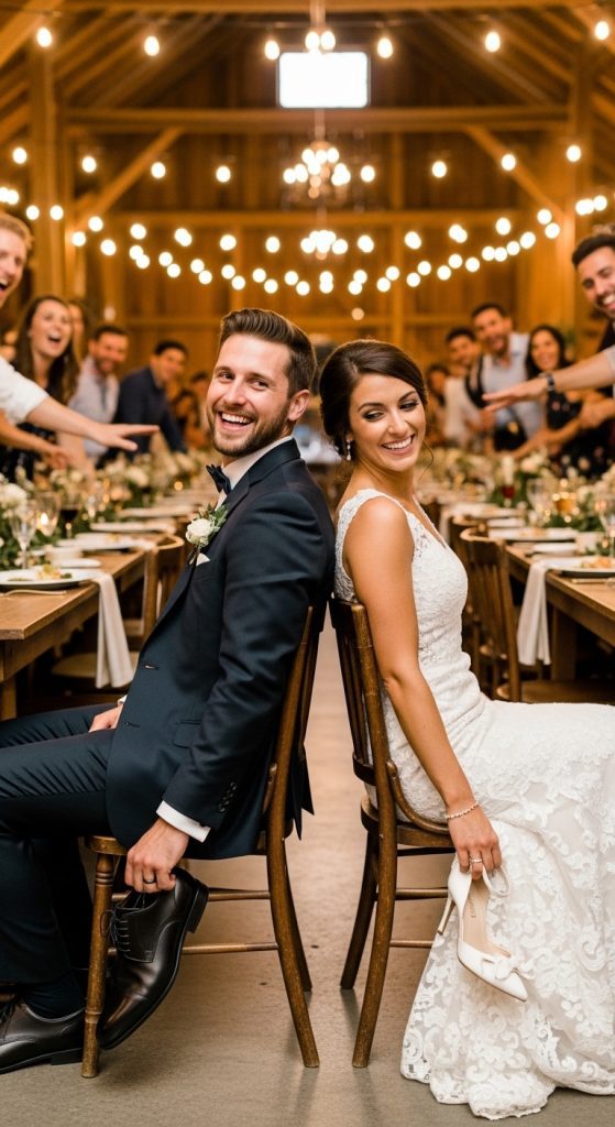 The Shoe Game is a hilarious and interactive way to see how well the couple knows each other. The bride and groom (or bride and bride/groom and groom) sit back-to-back holding one of their shoes and one of their partner’s shoes. A host or friend asks questions like, “Who said ‘I love you’ first?” or “Who is more likely to get lost?” The couple raises the shoe that corresponds to their answer. The guests love watching the funny and sometimes unexpected answers.