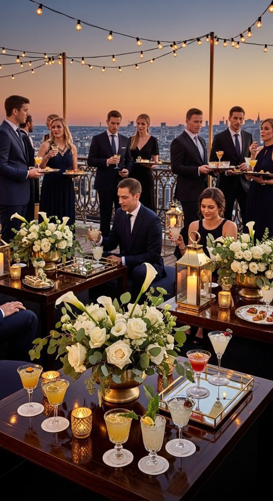 Nothing screams sophistication like a chic cocktail party. Choose a classy venue, such as a rooftop bar or a stylish hotel lounge, and serve an array of signature cocktails and hors d’oeuvres. A professional mixologist can elevate the experience, and you can even create a custom drink named after the couple. Complement the cocktails with soft jazz or acoustic music for a relaxed, yet refined, ambiance. Gold accents, crystal glasses, and fresh flowers can elevate the décor, making it feel glamorous without being overwhelming.