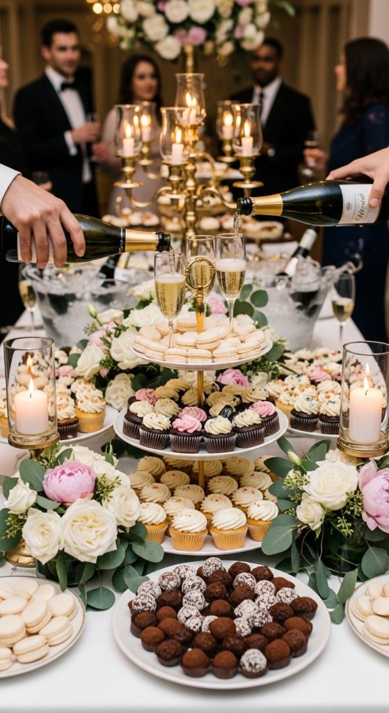 If the couple has a sweet tooth, a champagne and dessert-focused party is a decadent choice. Offer a variety of desserts, from cupcakes and macarons to chocolate truffles and fruit tarts, paired with sparkling wine or champagne. Elegant dessert tables with tiered stands, decorative signage, and floral arrangements make the spread visually stunning. This option is ideal for smaller gatherings and allows for a relaxed, indulgent, and Instagram-worthy celebration.