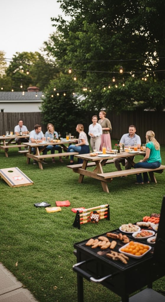 For a more casual, fun, and friendly vibe, a backyard BBQ is a perfect engagement party idea. Think fairy lights, picnic tables, and a delicious grill menu. Incorporate games like cornhole, ring toss, or giant Jenga for entertainment. A backyard BBQ provides a laid-back atmosphere where guests can mingle freely, and the couple can enjoy a party that is informal, relaxed, and full of laughter.