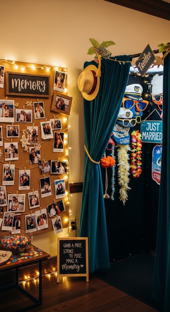 Photos capture the joy and excitement of the day, so consider setting up a dedicated photo booth or memory wall. Include fun props, themed backdrops, and signage featuring the couple’s names and engagement date. A memory wall can display photos from the couple’s relationship journey, engagement moments, or messages from family and friends. This not only serves as a fun activity but also creates lasting memories for everyone involved.