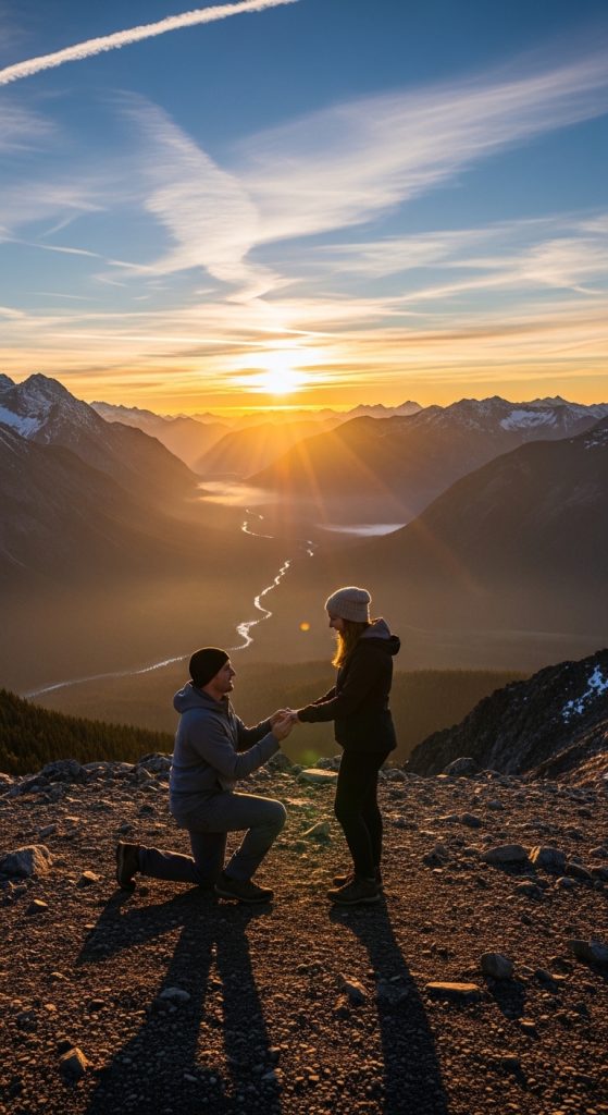 For couples who love hiking or simply enjoy breathtaking views, a mountain overlook can set the stage for a stunning engagement. Reach the summit together and take in the panoramic scenery. As the wind gently brushes past and the sun casts dramatic shadows over the landscape, get down on one knee for a truly epic moment. For an added personal touch, leave a small surprise picnic or a bouquet at the peak, ready to celebrate your engagement.