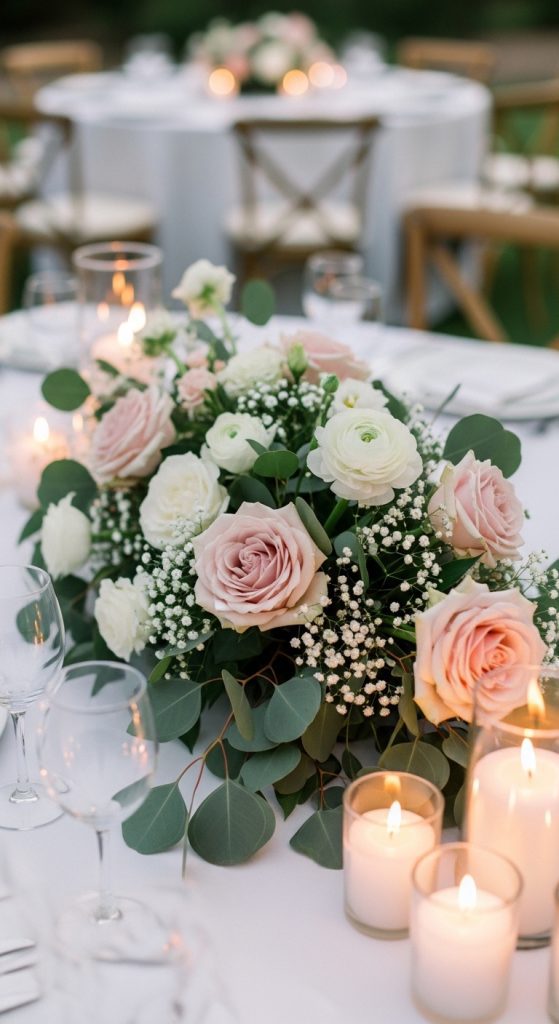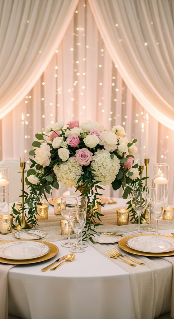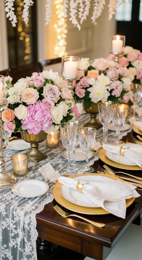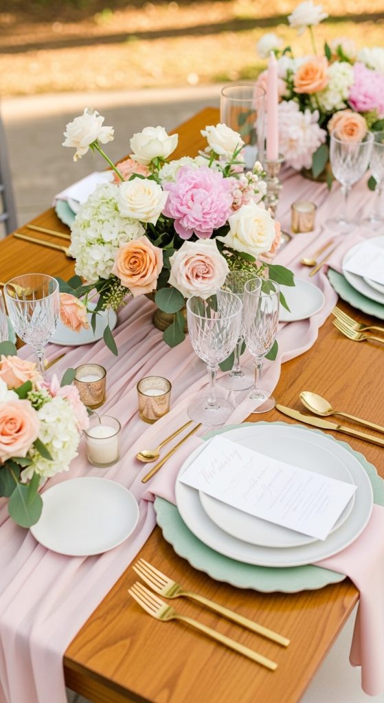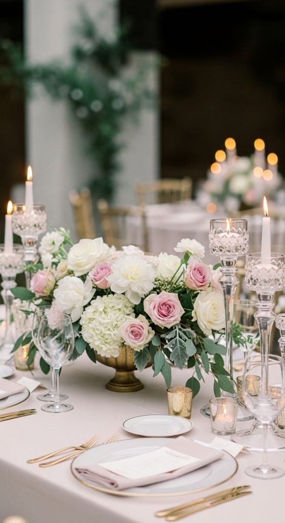 These accents reflect light beautifully and make the table feel luxurious. Gold pairs well with white, blush, and greenery, while silver complements modern and minimalist themes.