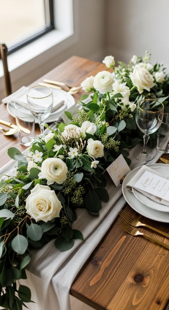Greenery is perfect for couples who love natural and fresh aesthetics. Use eucalyptus garlands, olive branches, or ivy runners across the table.