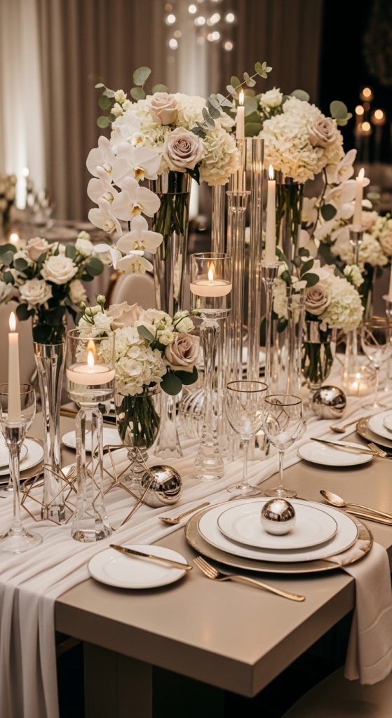 Crystal and glass elements add elegance and sparkle. Use crystal vases, glass charger plates, and transparent candle holders to create a refined look.