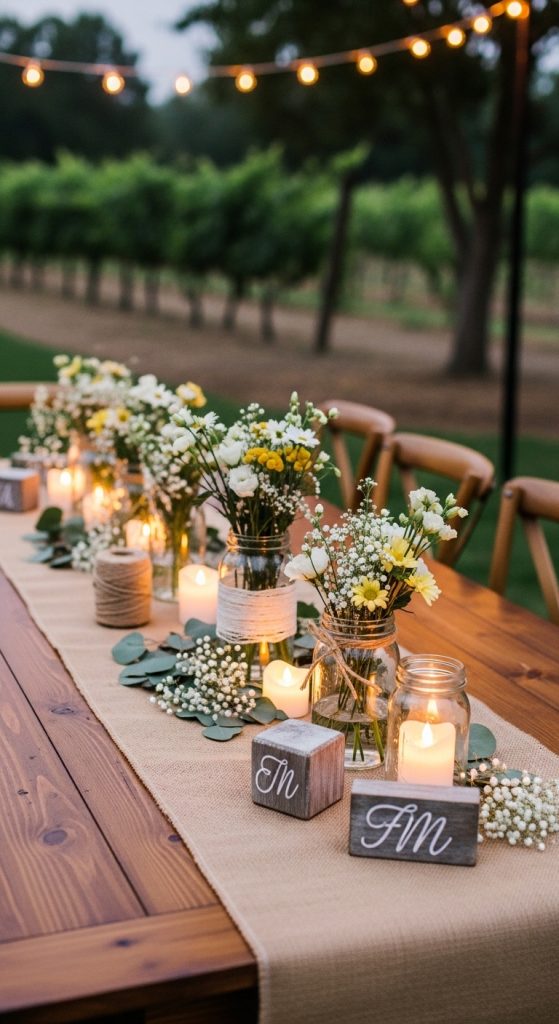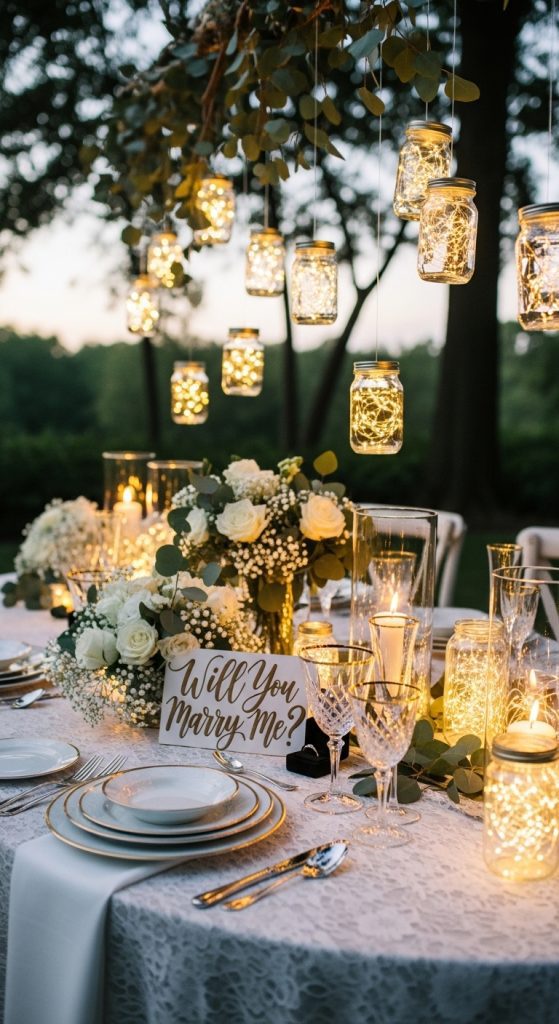 Fairy lights add a magical and enchanting touch. You can place them inside glass jars, wrap them around centerpieces, or run them along the table runner.