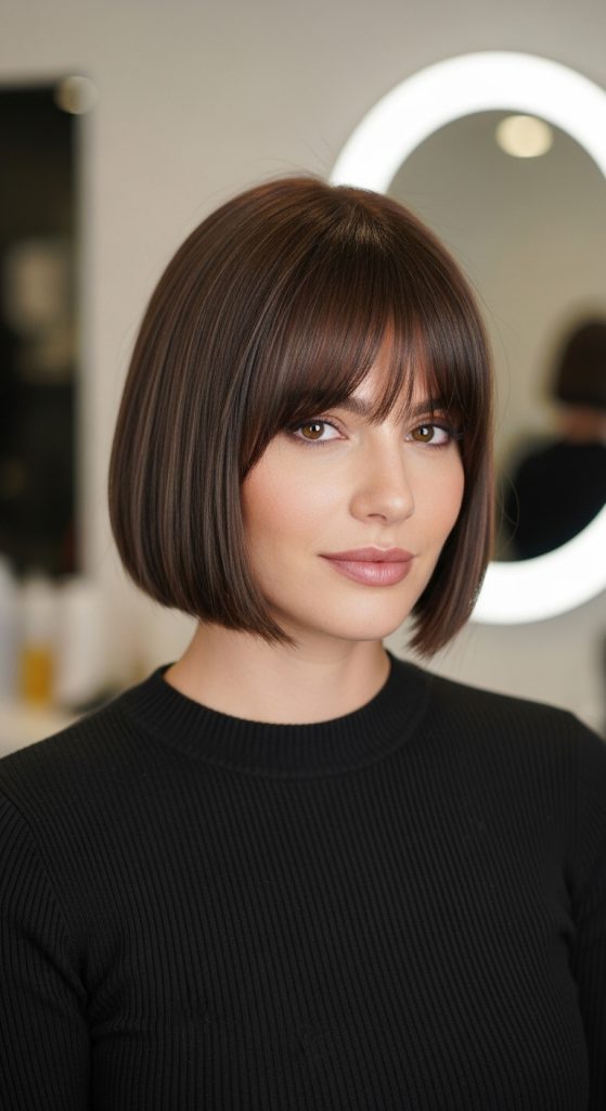 A short bob with curtain bangs creates a bold yet feminine look. The shorter length adds freshness and confidence, while curtain bangs soften the overall appearance.