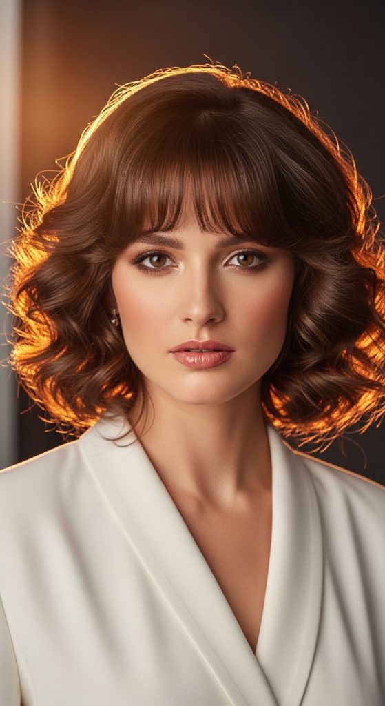 Soft curls combined with curtain bangs create a glamorous and romantic hairstyle. The curls add volume and texture, while the curtain bangs blend smoothly into the curls for a balanced look.