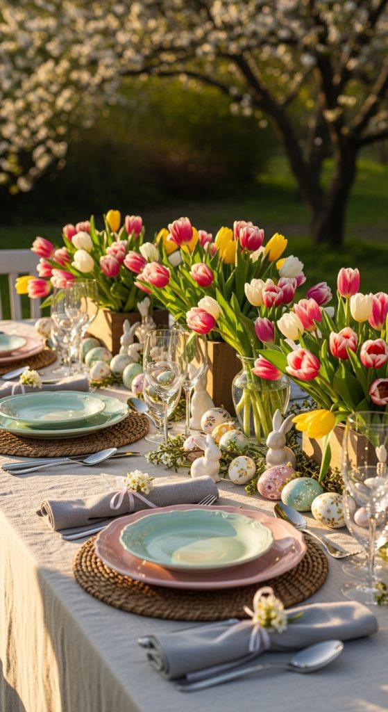 For an extra charming touch, place small decorated Easter eggs or mini flower pots at each guest’s seat as a thoughtful table favor.