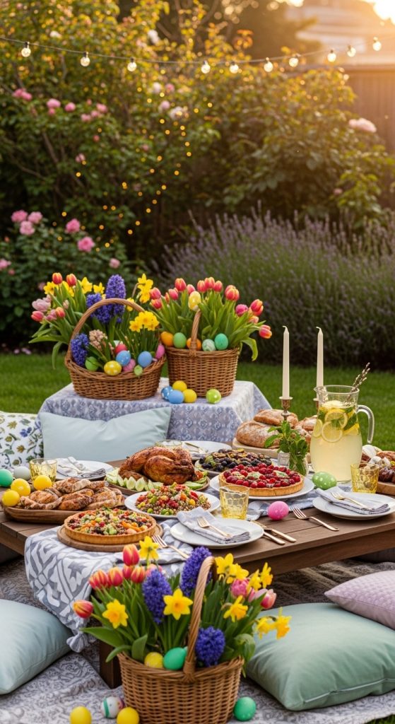 If the weather is pleasant, an outdoor Easter picnic dinner can be a delightful way to celebrate. Set up a picnic-style table in your backyard or garden with blankets, cushions, and low tables.