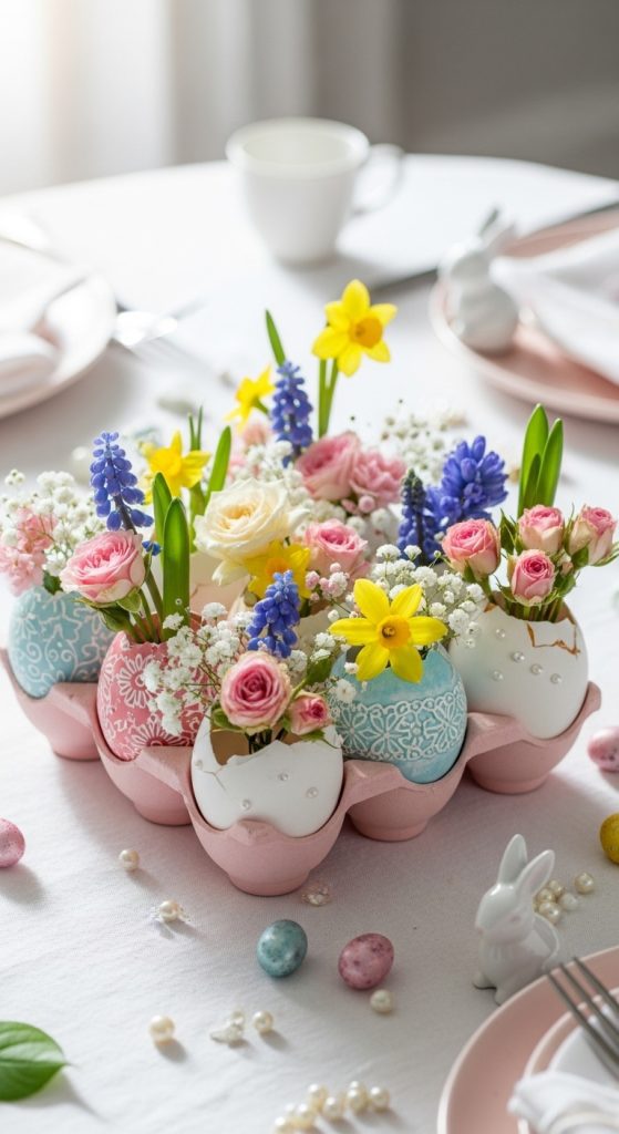 One of the most creative Easter table ideas is using real eggshells as tiny flower vases.
