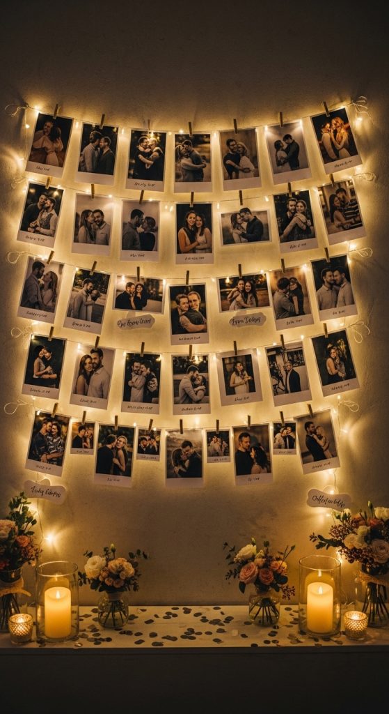 A memory wall is a beautiful and meaningful decoration idea that tells the couple’s love story. Display printed photos from different stages of the relationship—first dates, vacations, milestones, and special memories.