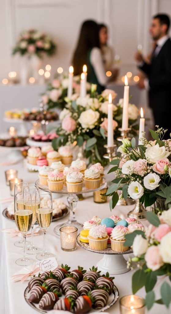 For couples who love sweet treats, a dessert and champagne party is a perfect engagement celebration idea. Create a beautifully styled dessert table featuring cakes, cupcakes, macarons, chocolate-covered strawberries, and pastries.