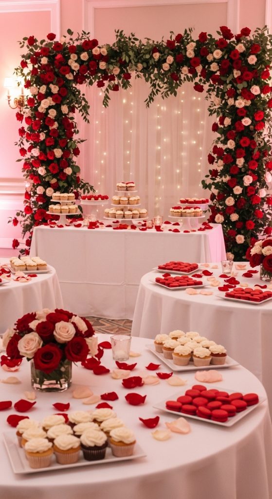 Decorate the venue with rose garlands, rose petals on tables, and floral arches made of red, blush, and white roses. Serve rose-inspired treats like rose cupcakes, rose macarons, and rose lemonade. You can even include a rose wall photo backdrop where guests can take memorable photos.