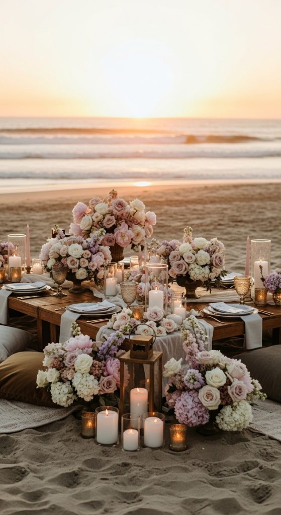 Set up low wooden tables with soft cushions and blankets on the sand. Decorate with seashells, lanterns, and soft pastel flowers. Guests can enjoy tropical drinks while watching the sunset, making the celebration feel relaxed yet incredibly romantic.