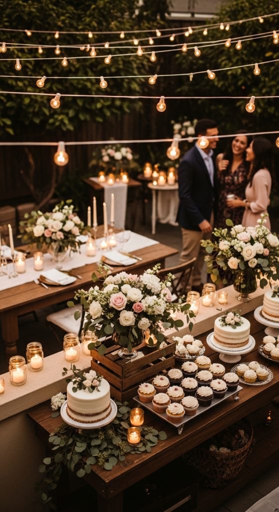 Add romantic details such as floral centerpieces, candles in mason jars, and soft draped fabrics. A small dessert table filled with cakes, cupcakes, and chocolates adds a sweet touch. This idea works perfectly for couples who want a beautiful yet budget-friendly celebration.