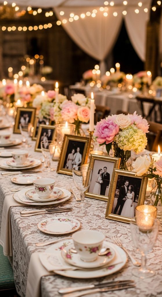 Hang photos on a string with small lights or display them on decorative boards. Guests will enjoy walking through the display and seeing your journey as a couple. You can also add handwritten notes, memories, and milestones to make it even more personal and meaningful.