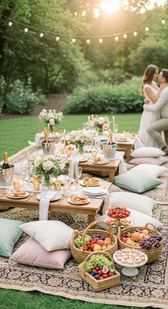 A romantic picnic party offers a relaxed yet stylish way to celebrate your engagement. Set up picnic blankets, low wooden tables, and comfortable cushions in a park or garden.