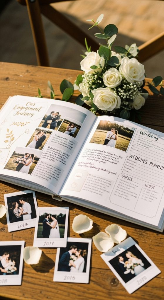 An engagement memory book allows the couple to document special moments during their engagement period. They can add photos, notes, wedding planning ideas, and memories from events like the engagement party.