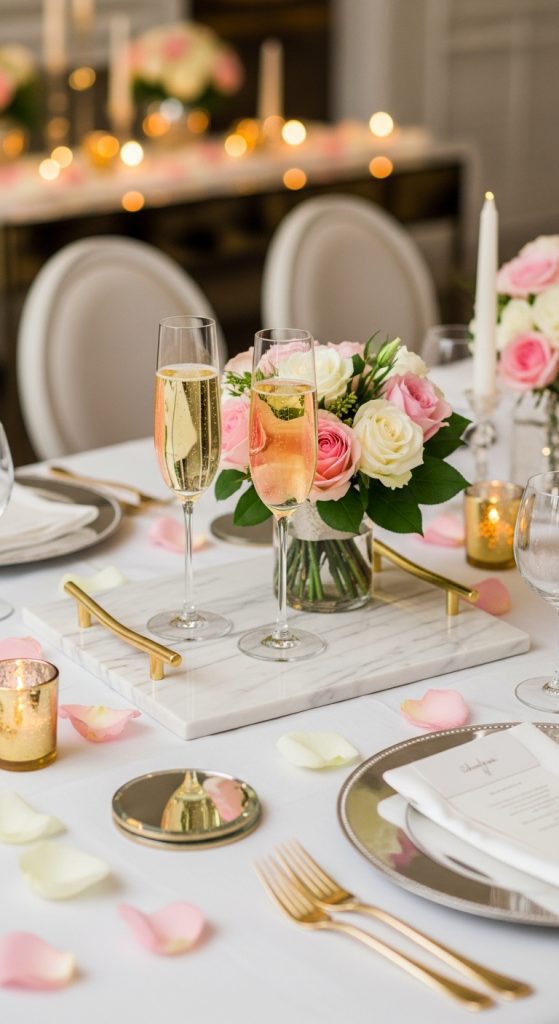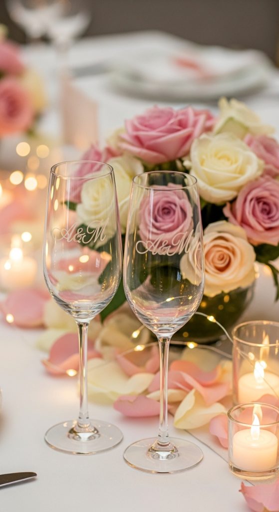 Crystal or engraved champagne flutes add sophistication and can even be customized with the couple’s initials or engagement date. Many couples also keep these glasses as keepsakes long after the celebration.