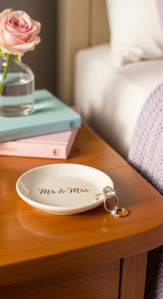 Personalized dishes with meaningful messages like “Mr. & Mrs.” or the couple’s initials add a sentimental touch. These decorative pieces are often placed on bedside tables or dressers.