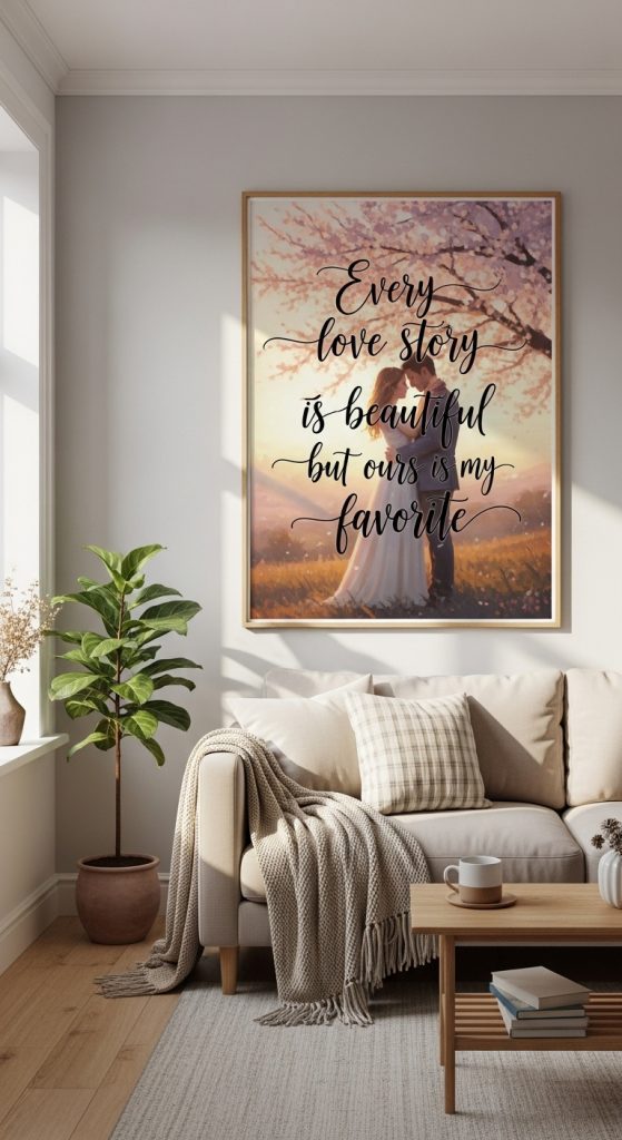 Framed prints, calligraphy art, or handcrafted wooden signs can serve as lasting reminders of the couple’s commitment. Choosing neutral colors ensures the piece blends easily with their home décor.