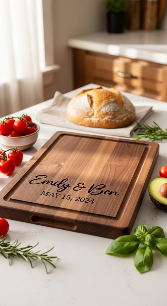A personalized cutting board is a practical yet sentimental engagement gift. Many boards can be engraved with the couple’s names, engagement date, or a short message.