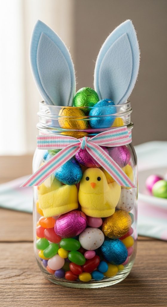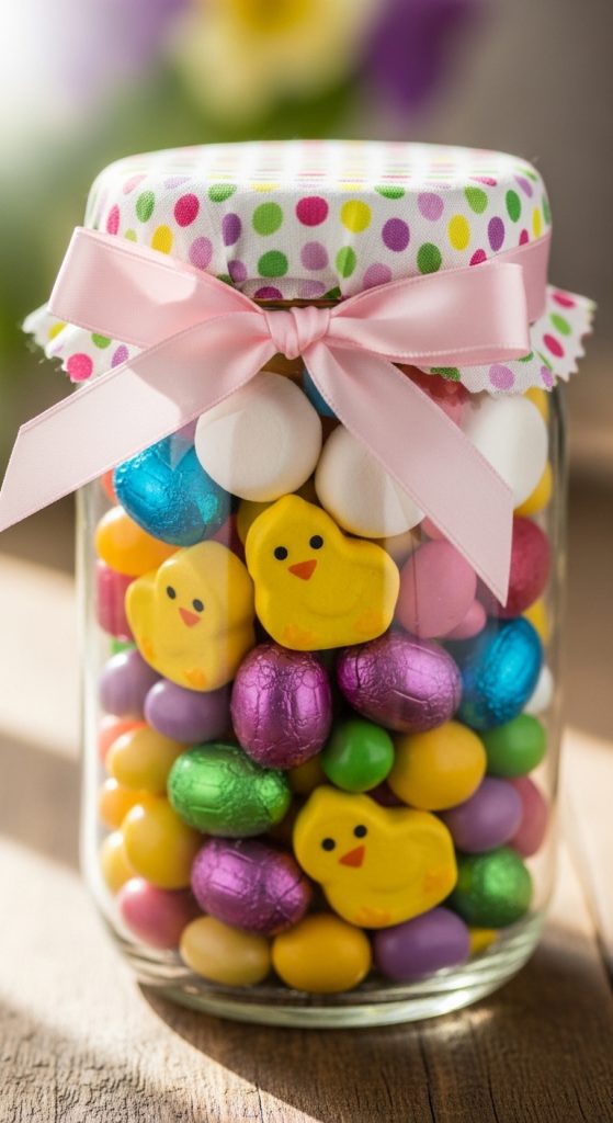 Mason jars are perfect for Easter candy displays. Fill them with colorful jelly beans, chocolate eggs, or pastel M&Ms. Decorate the jar lids with fabric, ribbons, or Easter-themed stickers. These candy jars make wonderful gifts for friends, neighbors, or teachers, and they can also serve as an interactive element for an Easter scavenger hunt.