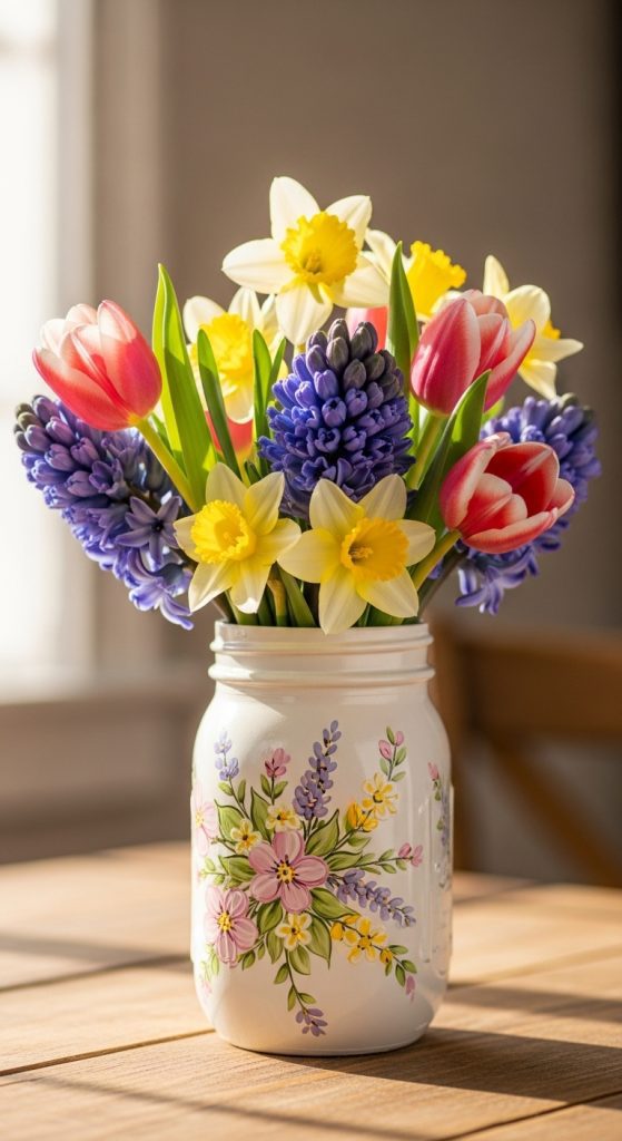 Add a touch of elegance to your Easter décor by painting mason jars with delicate floral designs. Use soft shades like pink, lavender, and yellow to create springtime blooms. You can paint flowers directly on the jar or use stencils for precision. Fill the jars with fresh flowers, faux blooms, or even feathers to complete the look. These floral jars make beautiful centerpieces or mantel decorations.