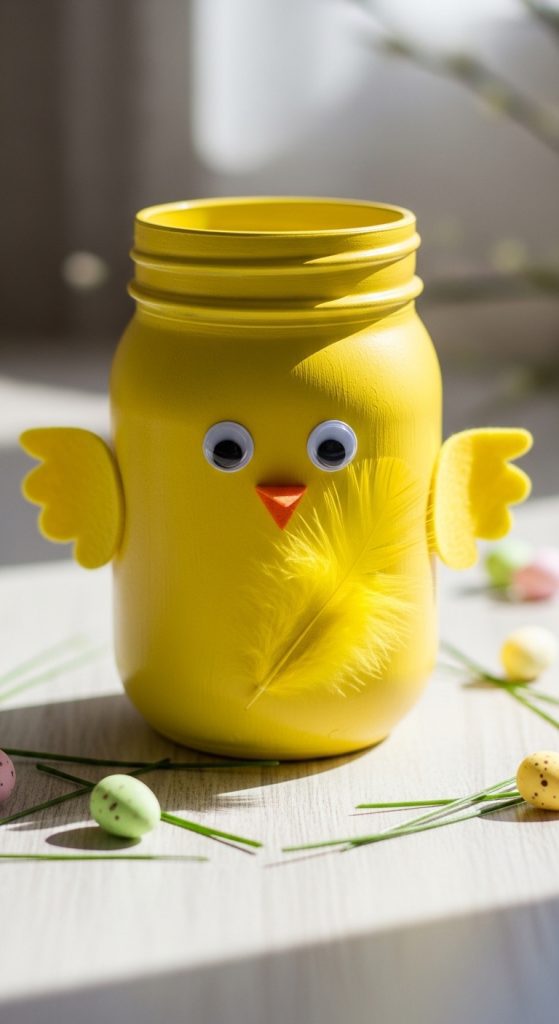 Create a flock of cute Easter chicks using mason jars. Paint the jars yellow and add googly eyes, an orange beak, and little felt wings. You can even place a small feather inside the jar to mimic a chick’s fluff. These jars are perfect for decorating a child’s room, Easter party tables, or as playful gifts for little ones.