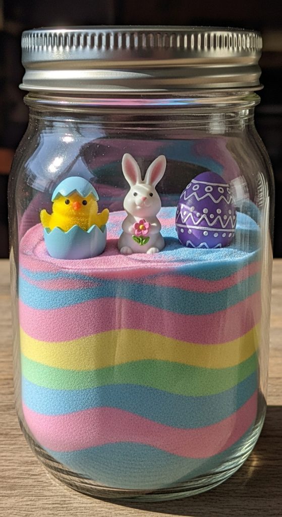 Mason jars make a fantastic canvas for Easter-themed sand art. Use colored sand in pastel shades to create layered designs inside the jar. You can add small Easter figurines or eggs between layers for added detail. This activity is great for kids and adults alike, offering a hands-on way to celebrate the holiday while producing a keepsake that can be displayed year after year.