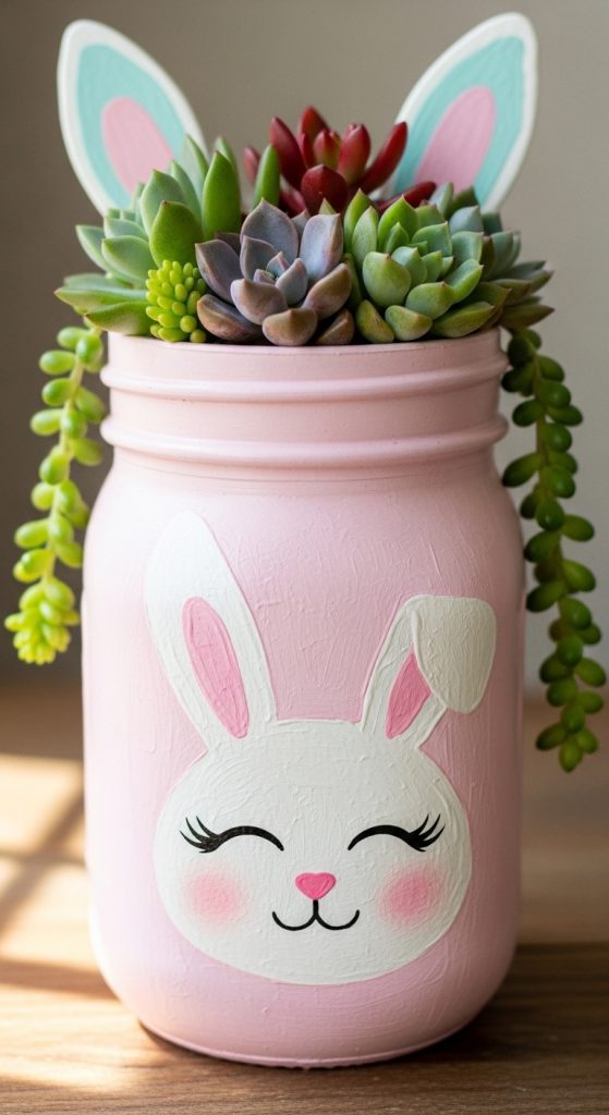 Combine the charm of Easter with the beauty of greenery by creating bunny succulent jars. Paint the jars with pastel colors and add simple bunny faces. Fill the jars with small succulents or cacti. These bunny succulent jars make an eco-friendly, long-lasting Easter gift and are a perfect addition to your spring décor.
