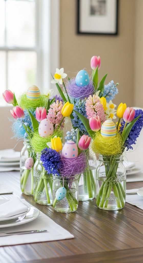 Elevate your dining table with Easter centerpiece mason jars. Fill the jars with seasonal flowers, Easter grass, and small decorative eggs. You can place multiple jars of varying heights together on a tray or runner to create a stunning table arrangement. This idea is perfect for brunches or family gatherings, adding both charm and elegance to your holiday setup.