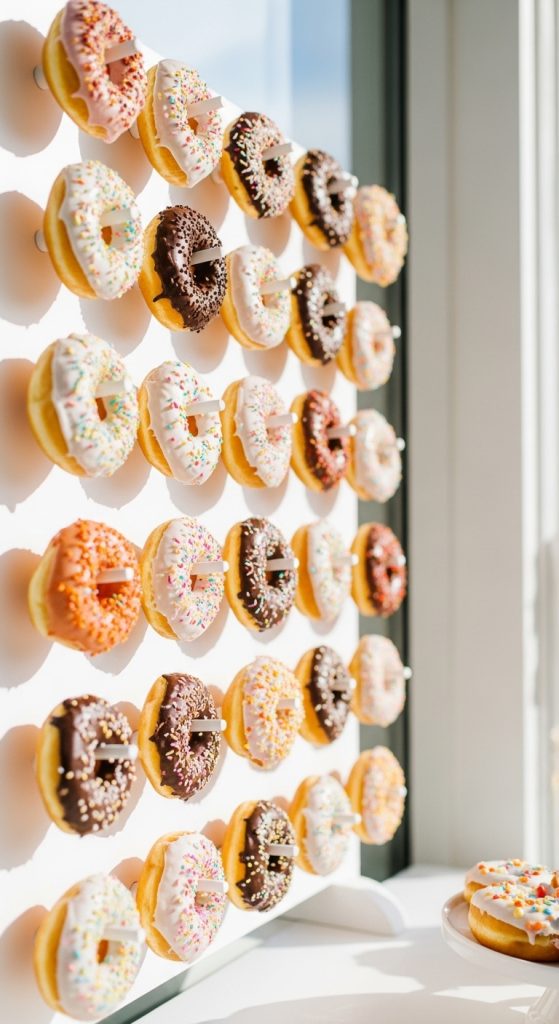 Choose a variety of flavors such as glazed, chocolate, strawberry, and powdered sugar. The donut wall not only adds a playful element to the bridal shower but also makes for fantastic photos.