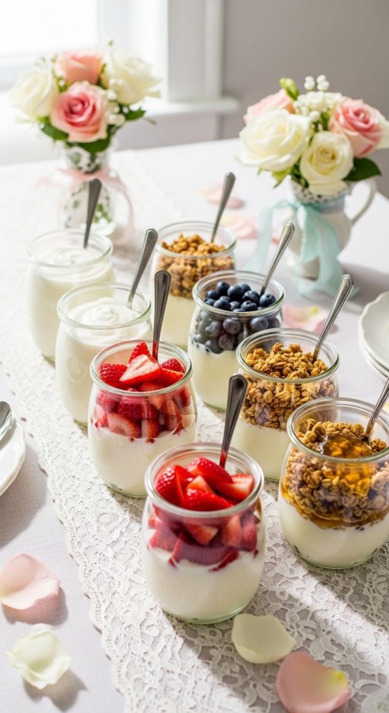 A parfait bar is both beautiful and interactive. Set up a station where guests can create their own yogurt parfaits using layers of creamy yogurt, fresh fruit, and crunchy toppings.