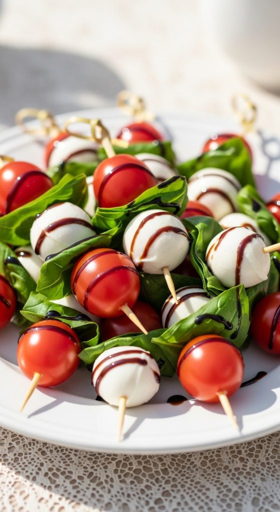 Drizzle with balsamic glaze and olive oil for a burst of flavor. These bite-sized treats are easy for guests to grab and enjoy without needing utensils. The red, white, and green colors also make them visually appealing and perfect for spring or summer bridal showers.