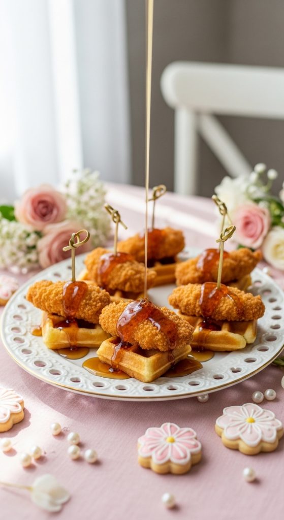 For a fun twist on comfort food, serve mini chicken and waffle bites. These sweet and savory treats combine crispy fried chicken pieces with small waffle squares, often topped with a drizzle of maple syrup or honey.
