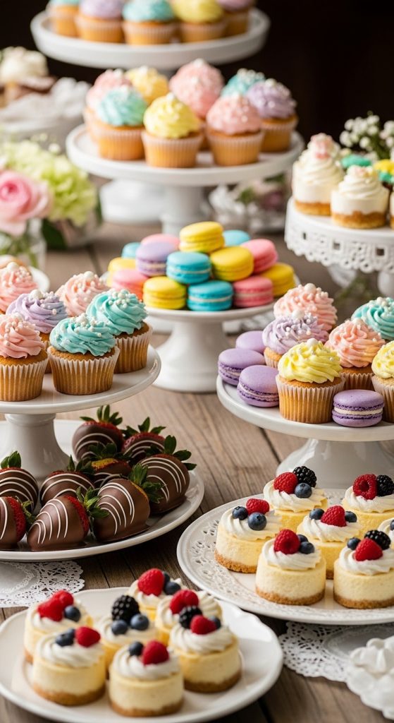 Include items such as cupcakes, macarons, chocolate-dipped strawberries, mini cheesecakes, and decorated sugar cookies. Choose desserts that match the shower’s color theme for a cohesive look. Display them on cake stands, trays, and decorative platters to create a stunning focal point.