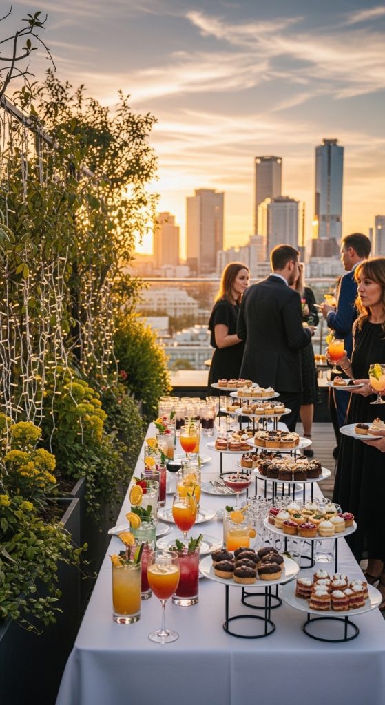 For brides who love the outdoors, a rooftop garden party combines natural beauty with urban sophistication. Decorate with hanging fairy lights, lush greenery, and chic planters for an inviting ambiance. A mixologist can craft signature cocktails using seasonal ingredients, while a dessert table with elegant sweets adds a luxurious touch. Rooftop views make for stunning photographs, giving the bride and her guests memories that feel both intimate and glamorous.