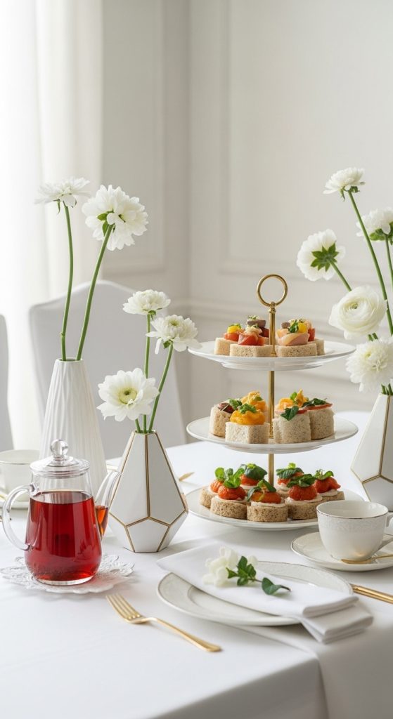 Elevate the traditional tea party by introducing unexpected elements. Serve rare teas or specialty blends and complement them with gourmet finger sandwiches, scones with exotic jams, and mini desserts. Instead of standard floral centerpieces, consider succulents, modern geometric vases, or minimalist arrangements. For entertainment, invite a tea sommelier to guide the tasting experience, turning the shower into a chic, interactive event.