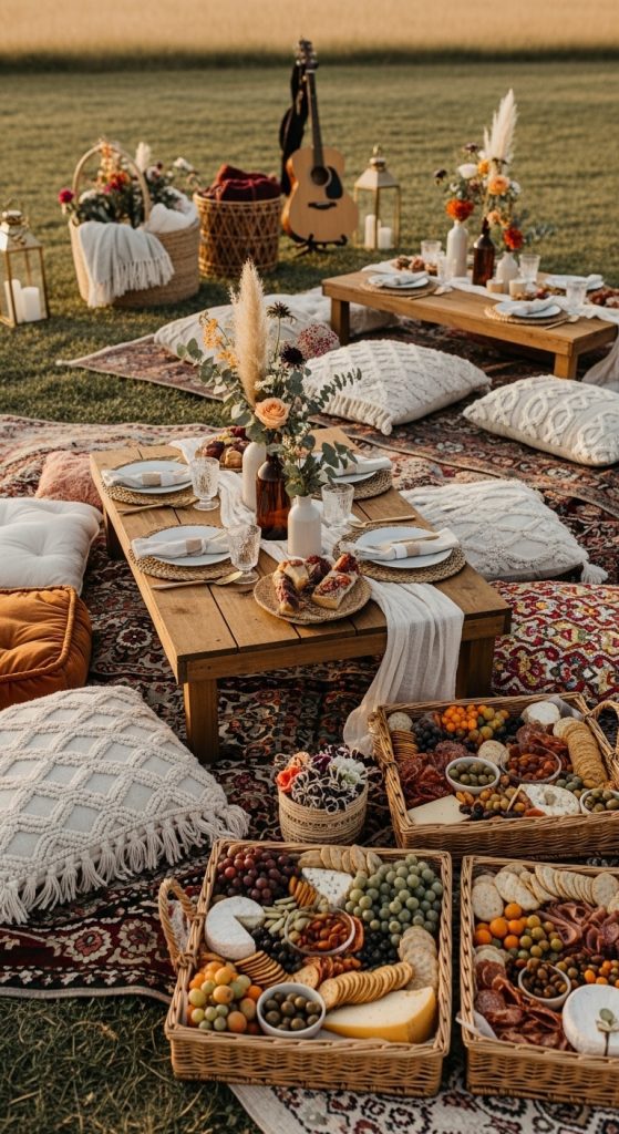Boho-chic picnics have become a popular choice for casual yet stylish bridal showers. Think low tables adorned with patterned rugs, colorful cushions, and eclectic floral arrangements. Serve gourmet picnic baskets with charcuterie, artisanal breads, and seasonal fruits. Include soft acoustic music or a live harpist to enhance the relaxed, bohemian vibe. This idea is perfect for brides who want a laid-back, intimate celebration with flair.