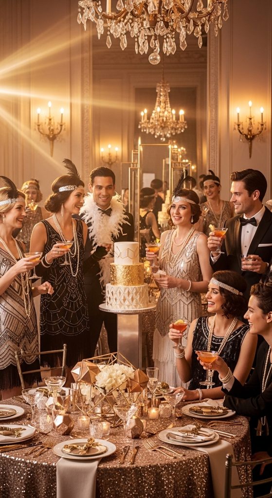 A vintage glam bridal shower channels old-Hollywood elegance. Incorporate metallic accents, vintage glassware, and art deco-inspired decor. Guests can enjoy classic cocktails served in crystal glasses, accompanied by a sophisticated canapé menu. Encourage a dress code inspired by the 1920s or 1950s to enhance the atmosphere. This type of shower is perfect for brides who love timeless glamour with a touch of nostalgia.