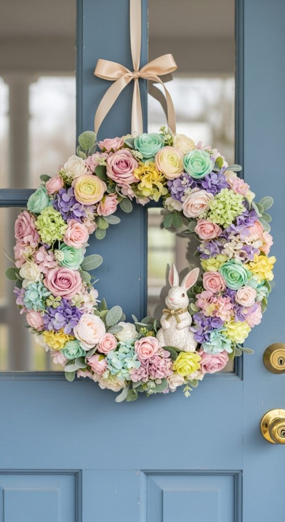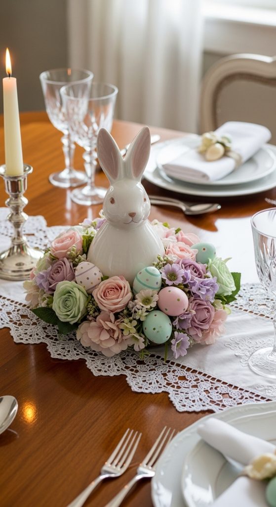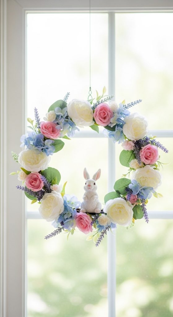 Add a modern twist by suspending a small silk flower wreath with a bunny figurine at the center. This floating bunny arrangement works well for hanging décor in front of windows or above a mantel. Choose flowers with varying textures and shades to create a dynamic, eye-catching display that appears to float in mid-air.