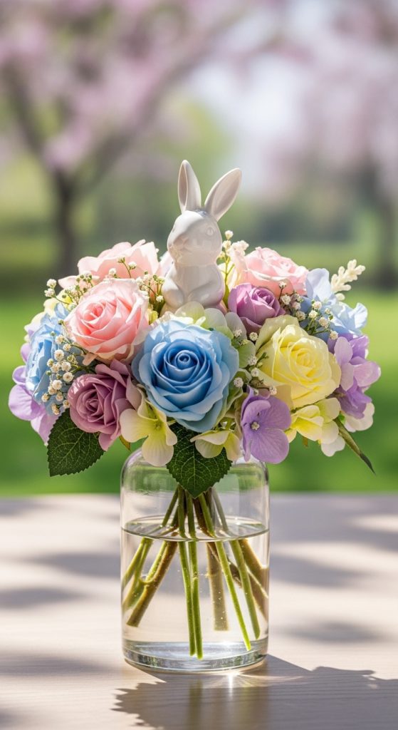 A timeless option, a classic pastel bunny bouquet features a medium-sized bunny figurine surrounded by an assortment of silk flowers in soft pinks, lavenders, and yellows. Add greenery like silk ferns or eucalyptus to create a natural flow. This arrangement works well in a clear vase or a rustic wicker basket, making it versatile for any Easter setting.