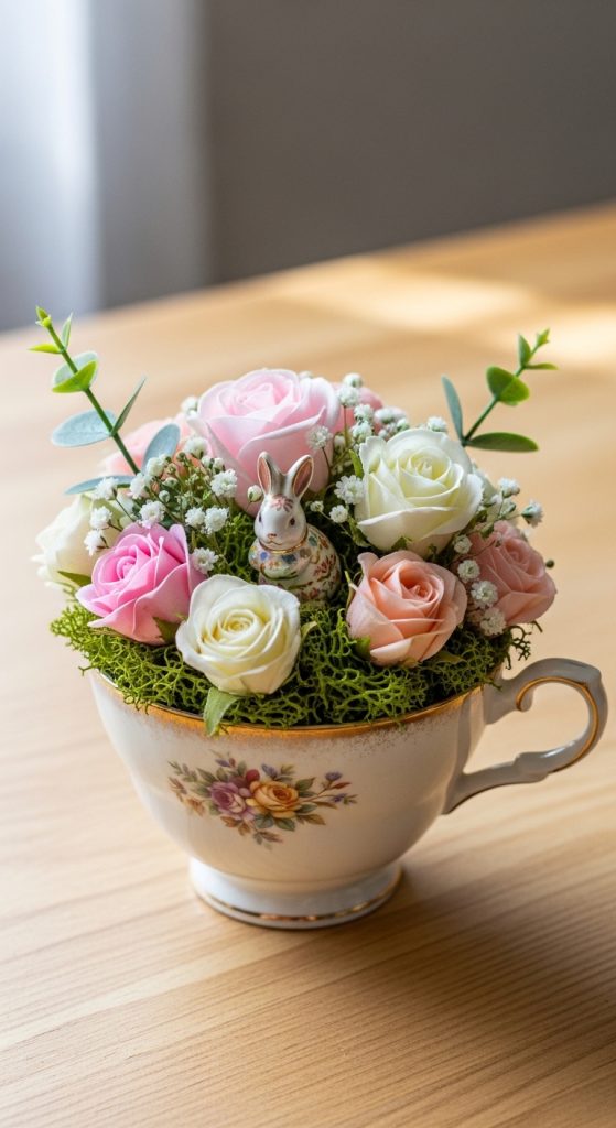 Transform a vintage teacup into an Easter-themed centerpiece by placing a small bunny figurine inside and surrounding it with miniature silk flowers. This arrangement works beautifully for brunch tables or small side tables, giving a whimsical, delicate touch. Use flowers like tiny roses, daisies, or hydrangeas to fill the cup, and add moss at the base for extra texture.