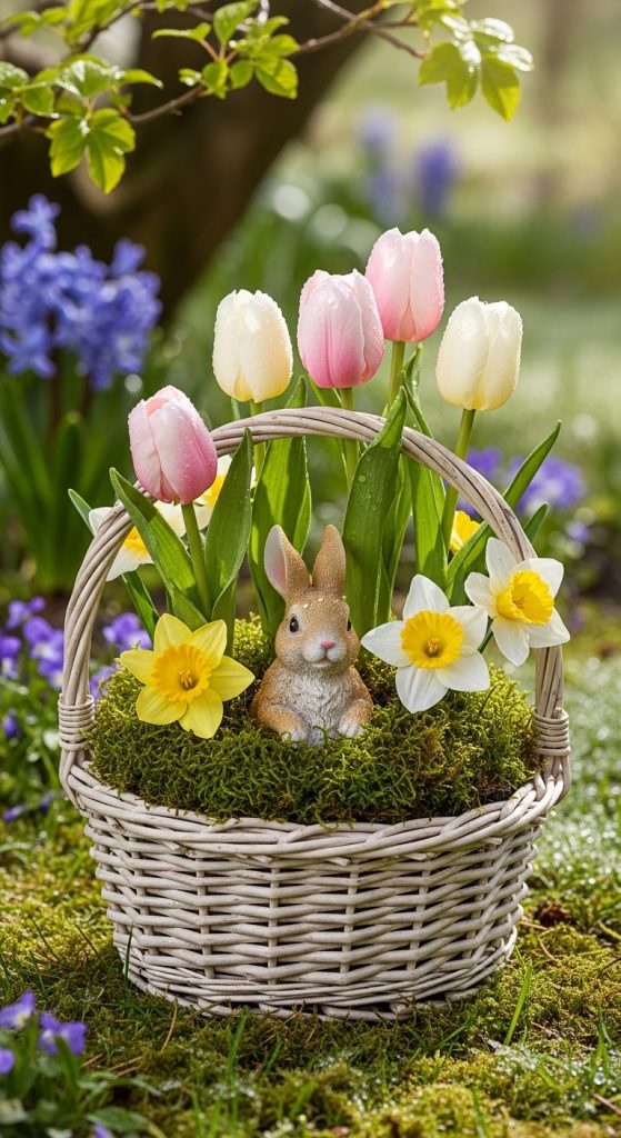 Bring the outdoors in with a bunny garden basket arrangement. Place a small bunny figurine among a mix of silk tulips, daffodils, and lilies in a decorative basket. Use faux grass or moss as a base to mimic a spring garden. This setup is perfect for adding a touch of Easter charm to your dining table or living room.