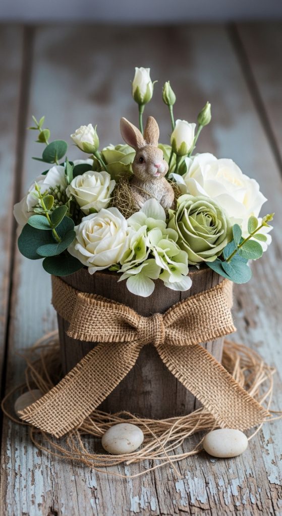 For a farmhouse-inspired décor, select a distressed wooden container or galvanized tin and fill it with silk flowers, placing a bunny figurine in the center. Incorporate earthy tones such as cream, sage green, and muted yellows to create a cozy, rustic look. Twine or burlap ribbons can be added to the container for an extra country charm.