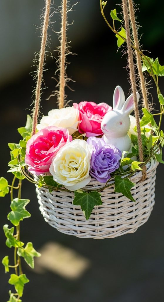Think beyond tabletop arrangements with a hanging bunny basket. Use a small woven basket, suspend it with ribbon or twine, and fill it with silk flowers and a bunny figurine. This arrangement is great for porches, entryways, or even as part of a larger Easter-themed wall display. Choose trailing flowers like ivy or wisteria to add movement.