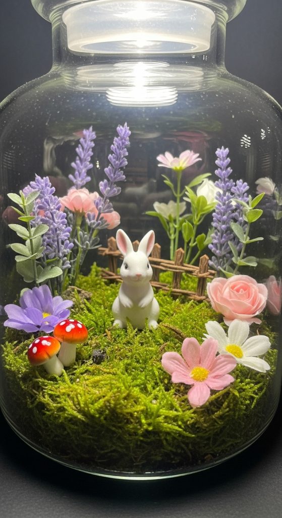A glass terrarium can be transformed into a magical Easter display. Place a small bunny figurine inside a terrarium, and surround it with silk flowers, moss, and tiny faux mushrooms. This arrangement brings a miniature spring scene indoors and can double as a decorative accent in a living room, office, or bedroom.